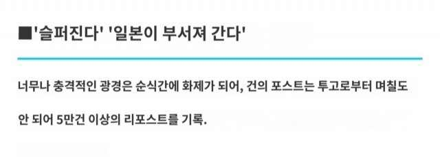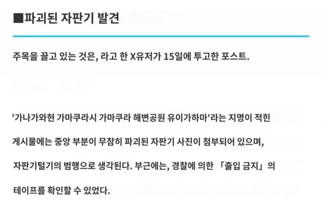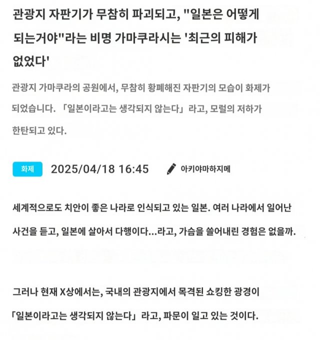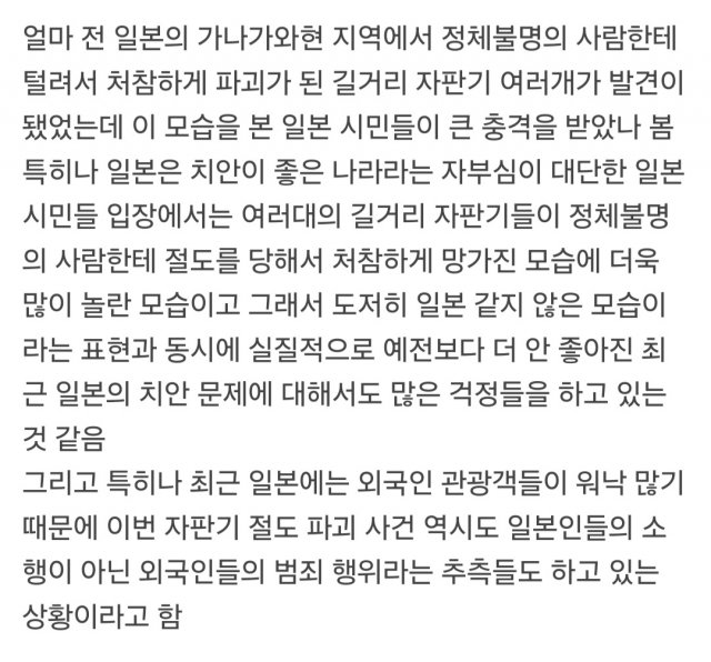 털려서 파괴가 된 일본의 길거리 자판기 상황 작성자 정보 가스맨 작성 작성일 2025.11.12 15:45 컨텐츠 정보 2 조회 목록 답글 본문 관련자료 이전 백종원 화법을 똑같이 쓰는 요리만화 작성일 2025.11.12 17:20 다음 거기 편했나 봐 ㅋㅋ 작성일 2025.11.12 14:51 댓글 0 등록된 댓글이 없습니다. Select File Upload File 목록 답글