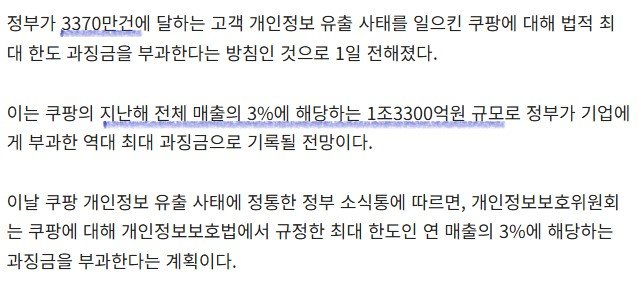 쿠팡이 유출규모가 3370만건이라는 skt유출 규모를 훌쩍넘는 역대 최고 유출건수 라는 것과 쿠팡의 작년 매출액이 44조 4700억원이라 이중 3%를 책정하여 1조 3340억원이라는 어마어마한 금액이 산정된 거임.