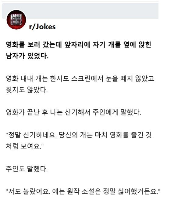 영화관에 개를 데려온 남자 작성자 정보 쇼잉더 작성 작성일 2025.07.21 04:55 컨텐츠 정보 7 조회 목록 답글 본문 이런 양키유머 좋앜ㅋㅋㅋ 관련자료 이전 ㅋㅋㅋㅋ 텍사스는 볼티 찢기 장인이네 ㄹㅇ 작성일 2025.07.21 05:14 다음 귀여운 히나 작성일 2025.07.21 04:29 댓글 0 등록된 댓글이 없습니다. Select File Upload File 목록 답글