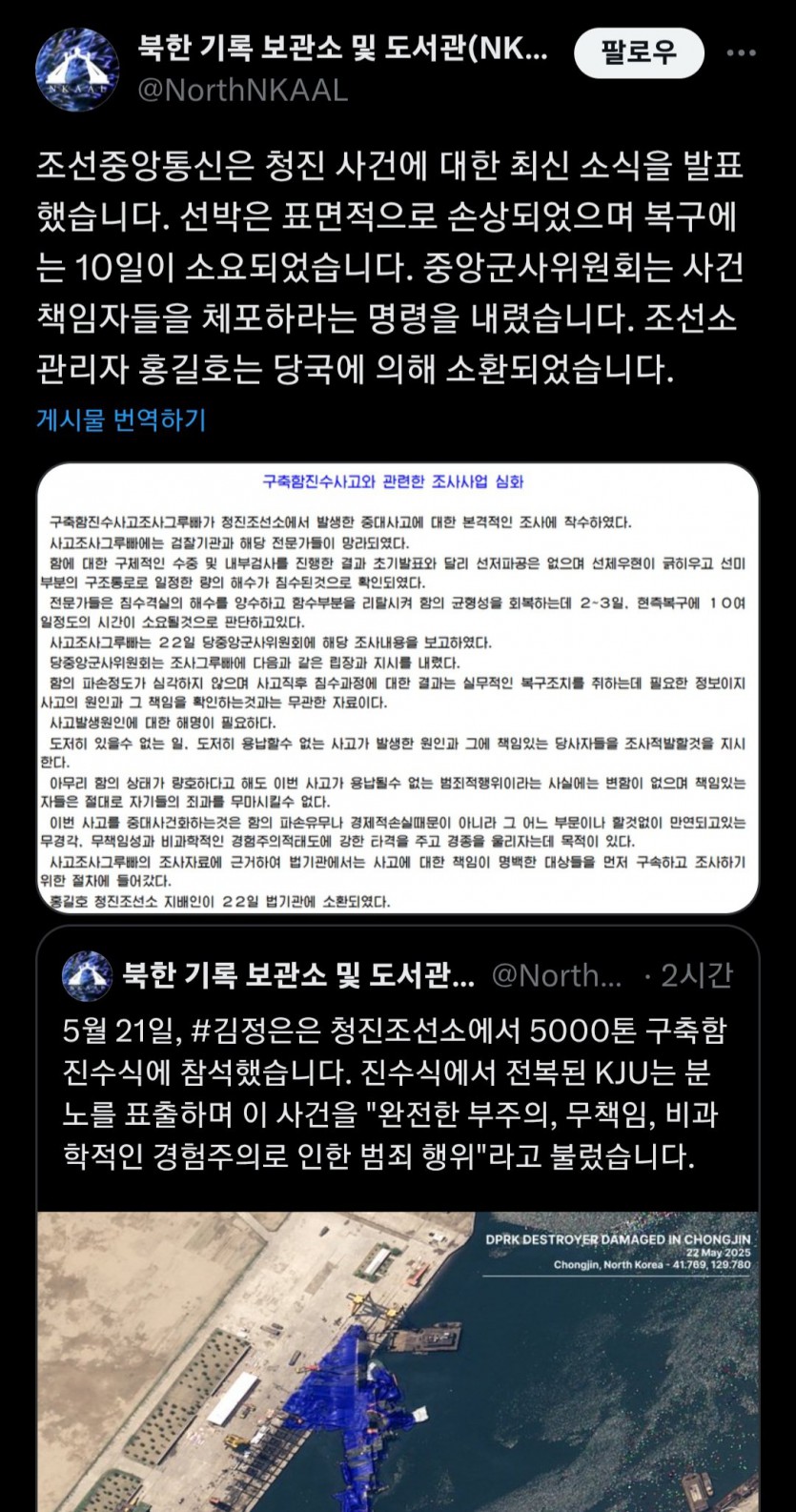북한)진수식 중에 사고 난 군함 10여일 정도면 수리 가능하다 작성자 정보 춘이 작성 작성일 2025.12.27 12:00 컨텐츠 정보 3 조회 목록 답글 본문 관련자료 이전 신현희와 김루트의 신현희 근황 작성일 2025.12.27 12:11 다음 2025 한국인 최애 과자 TOP 10 작성일 2025.12.27 11:24 댓글 0 등록된 댓글이 없습니다. Select File Upload File 목록 답글