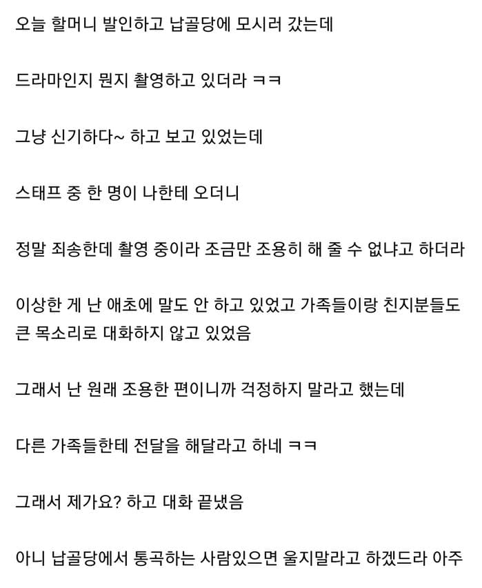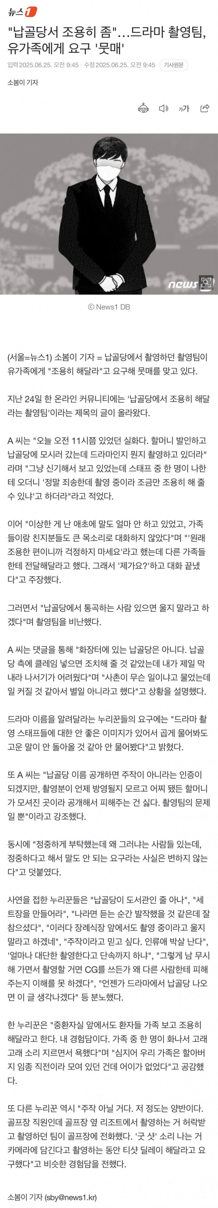 납골당서 조용히 좀 드라마 촬영팀, 유가족에게 요구 뭇매 작성자 정보 해외사이픽 작성 작성일 2025.07.14 02:32 컨텐츠 정보 2 조회 목록 답글 본문 관련자료 이전 저녁은 족발로 가요옷 작성일 2025.07.14 02:51 다음 우정잉 오징어게임 감상평 작성일 2025.07.14 02:00 댓글 0 등록된 댓글이 없습니다. Select File Upload File 목록 답글