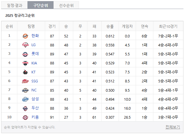 오늘자 크보 순위 작성자 정보 이와세 작성 작성일 2025.07.13 23:53 컨텐츠 정보 3 조회 목록 답글 본문 주요내용한화는 6연승을 달리며 1위를 유지 2위부터 8위까지 5.5 게임 정도가 차이나는 수준으로 치열키움 승률이 2할대에서 3할대로 오름분위기 좋았던 기아가 한화만나서 4연패 박음 관련자료 이전 로또 당첨된걸 말하면 안되는 이유 작성일 2025.07.14 00:11 다음 그냥 서로 3이닝 까지는 그냥 무난하게 넘기자 작성일 2025.07.13 23:22 댓글 0 등록된 댓글이 없습니다. Select File Upload File 목록 답글