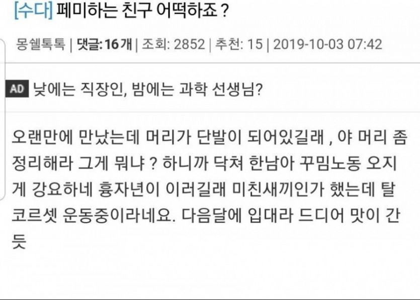 오랜만에 만났더니 페미가 되어버린 친구 작성자 정보 비욘세다 작성 작성일 2025.12.26 03:11 컨텐츠 정보 1 조회 목록 답글 본문 ㅋㅋㅋ 관련자료 이전 뉴스에서 논란 중인 쿠팡 수수료 작성일 2025.12.26 03:21 다음 세상아 덤벼라 작성일 2025.12.26 02:26 댓글 0 등록된 댓글이 없습니다. Select File Upload File 목록 답글