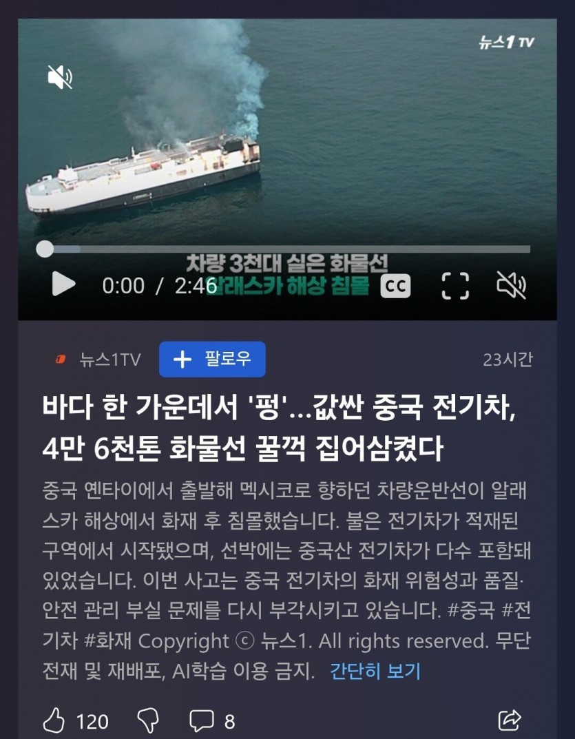 중국 전기차 실은 화물선 펑~! 작성자 정보 루이지롱 작성 작성일 2025.07.07 17:17 컨텐츠 정보 3 조회 목록 답글 본문 ㅋㅋㅋㅋ싼게 비지떡이다 이말이야~~ 이래도 요즘 중국차 빨아주는 뉴스 존나 뽑던데 병신같은 언론들 회사 주차장에 중국차 놔드려야됨 관련자료 이전 조현우 선방 10개 ㄷㄷㄷㄷㄷ 도르트문트, 플루미넨시 16강 진출 작성일 2025.07.07 17:39 다음 극J 아빠의 가족 여행계획표ㅋㅋㅋㅋ 작성일 2025.07.07 16:57 댓글 0 등록된 댓글이 없습니다. Select File Upload File 목록 답글