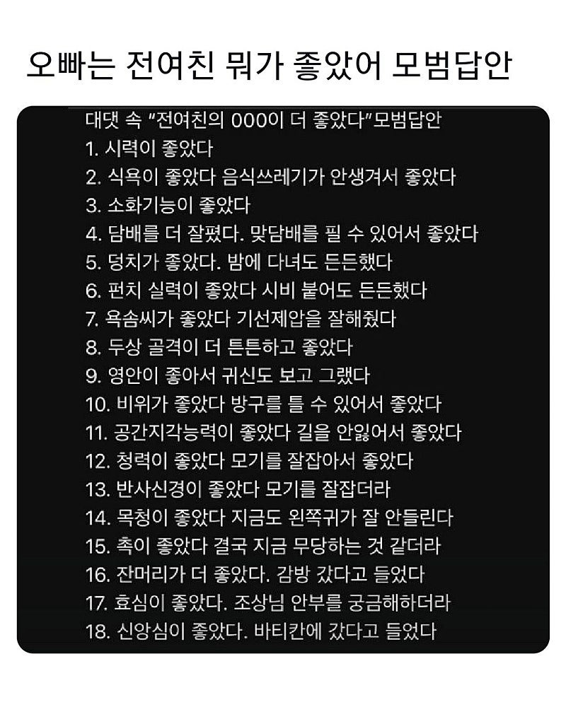 오빠는 전여친 뭐가 좋았어 작성자 정보 삼성팬 작성 작성일 2025.11.18 04:01 컨텐츠 정보 36 조회 목록 답글 본문 관련자료 이전 모스케라, 아스날행 눈앞, 이번 주 안에 끝난다 작성일 2025.11.18 04:18 다음 빅5 가톨릭대 의대서도 선배 신고 족보 안 준다며 복귀 방해 작성일 2025.11.18 03:12 댓글 0 등록된 댓글이 없습니다. Select File Upload File 목록 답글
