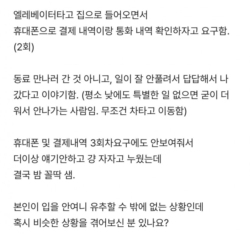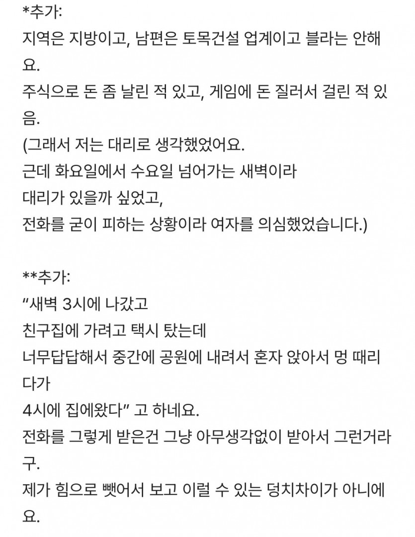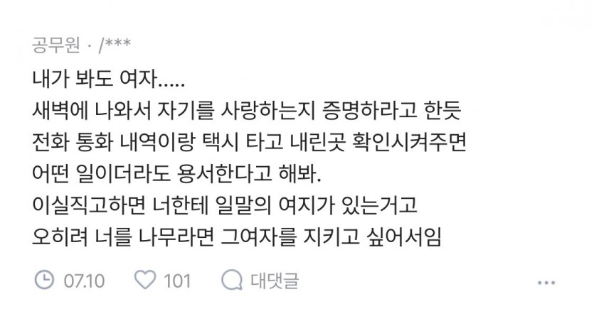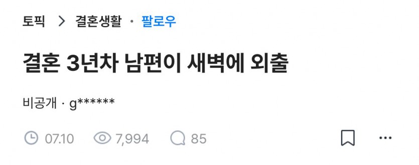 새벽에 외출하는 남편을 의심하는 아내.. 작성자 정보 길품 작성 작성일 2025.12.17 00:06 컨텐츠 정보 5 조회 목록 답글 본문 관련자료 이전 어마어마한 신혼집 공개한 손연재 작성일 2025.12.17 00:26 다음 가격고집 순대국 근황 작성일 2025.12.16 22:53 댓글 0 등록된 댓글이 없습니다. Select File Upload File 목록 답글
