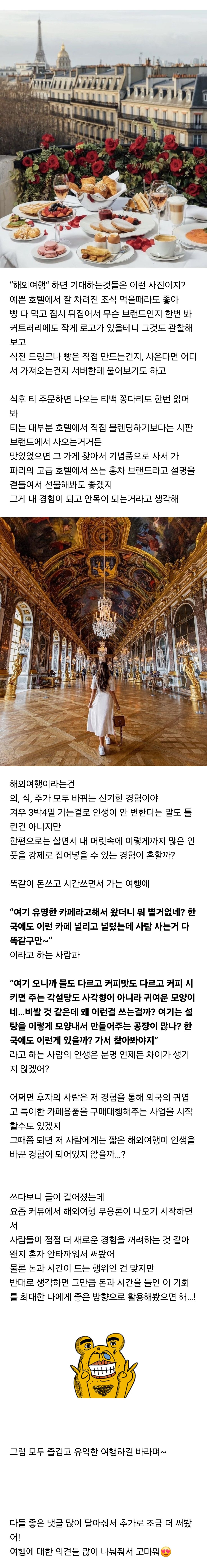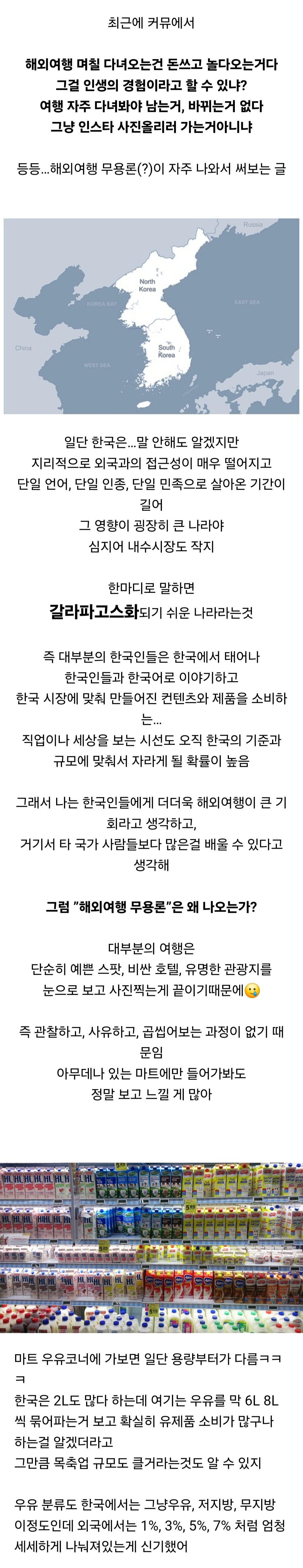 해외여행이 큰 경험이 아니라고 하는 이유 작성자 정보 나라고 작성 작성일 2024.03.12 21:20 컨텐츠 정보 648 조회 목록 답글 본문 관련자료 이전 마이클잭슨이 한국에서 제일 좋아했었다는 음식 작성일 2024.03.12 21:53 다음 축구가보자 작성일 2024.03.12 20:49 댓글 0 등록된 댓글이 없습니다. Select File Upload File 목록 답글