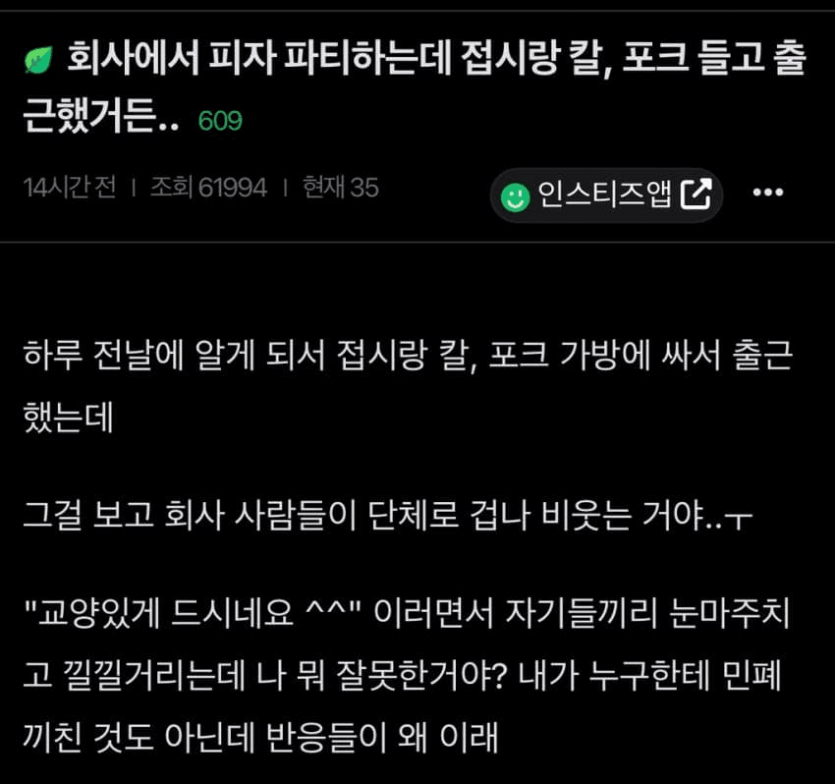회사에서 피자 파티하는데 접시,칼,포크 들고 출근한 사람 작성자 정보 한소리두소리 작성 작성일 2025.11.30 04:34 컨텐츠 정보 29 조회 목록 답글 본문 관련자료 이전 올해 휴가는 바다 말고 산으로 가야겠다 ㅎㅎㅎ 작성일 2025.11.30 05:30 다음 국야 없는 날은 그냥 심심 그 잡채..... 작성일 2025.11.30 03:46 댓글 0 등록된 댓글이 없습니다. Select File Upload File 목록 답글