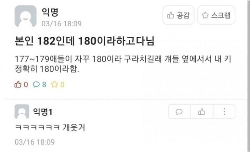 본인 키를 줄여서 말하고 다닌다는 180남자 작성자 정보 니미시비다 작성 작성일 2025.11.19 12:18 컨텐츠 정보 6 조회 목록 답글 본문 관련자료 이전 대학생 용돈별 생활 수준 작성일 2025.11.19 13:23 다음 세종 여성 오진으로 유방 절제 검체 바뀌어 작성일 2025.11.19 12:07 댓글 0 등록된 댓글이 없습니다. Select File Upload File 목록 답글