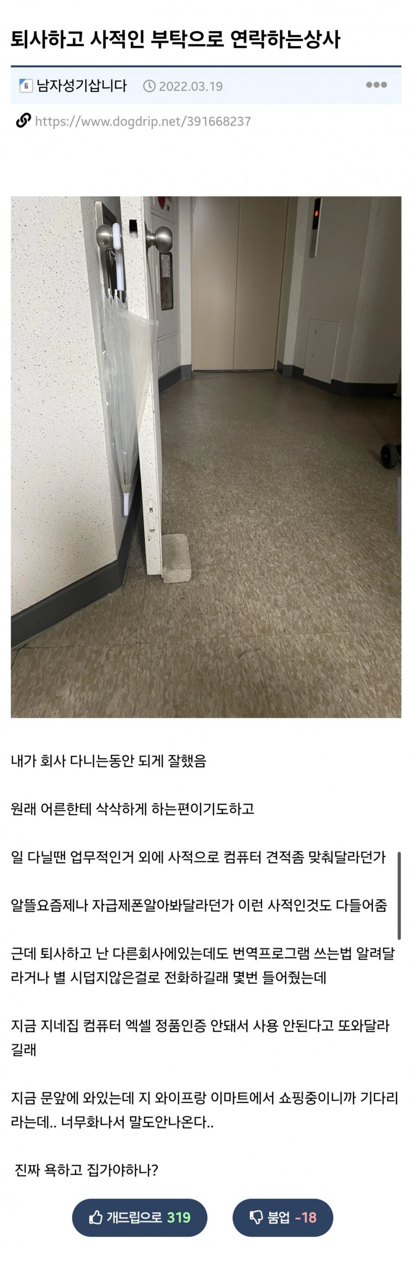 퇴사하고 사적인 부탁으로 연락하는 상사 작성자 정보 상한의달인 작성 작성일 2025.12.02 00:06 컨텐츠 정보 1 조회 목록 답글 본문 관련자료 이전 코난 검은조직에 대한 tmi 작성일 2025.12.02 00:42 다음 이거 세트로 줬어야 하는거 아님 ? 작성일 2025.12.01 22:22 댓글 0 등록된 댓글이 없습니다. Select File Upload File 목록 답글