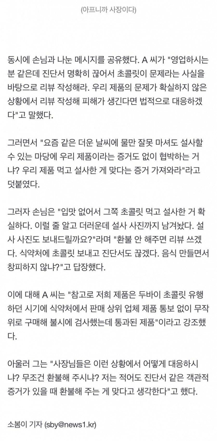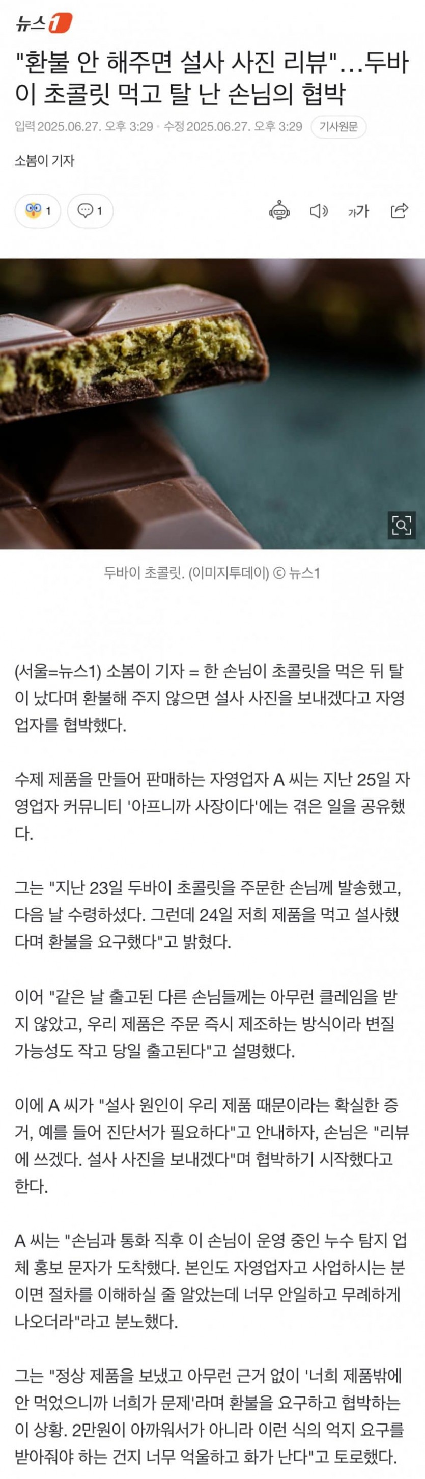환불 안 해주면 설사 사진 리뷰 두바이 초콜릿 먹고 탈 난 손님의 협박 작성자 정보 블루스카이블루 작성 작성일 2026.01.27 16:48 컨텐츠 정보 2 조회 목록 답글 본문 관련자료 이전 게임 잘 모르는 일본 유튜버가 본 페이커의 인상 ㅋㅋㅋ 작성일 2026.01.27 17:43 다음 월요일 끝났다아아아!! 작성일 2026.01.27 16:16 댓글 0 등록된 댓글이 없습니다. Select File Upload File 목록 답글